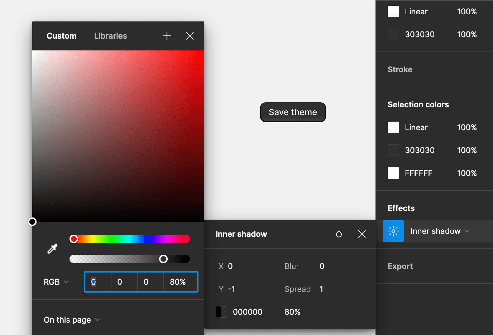 For the first shadow’s values 0rem -0.0625rem 0rem 0.0625rem rgba(0,0,0,.8) inset, I create an Inner Shadow (from “inset”) with values of X:0, Y:-1, Blur:0, Spread:1, and color of full black at 80% opacity. This adds the bottom dark line.