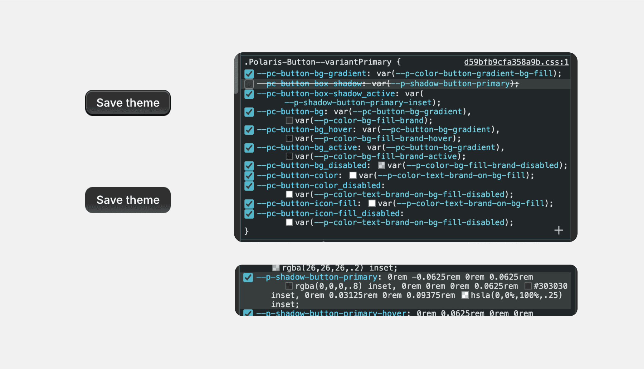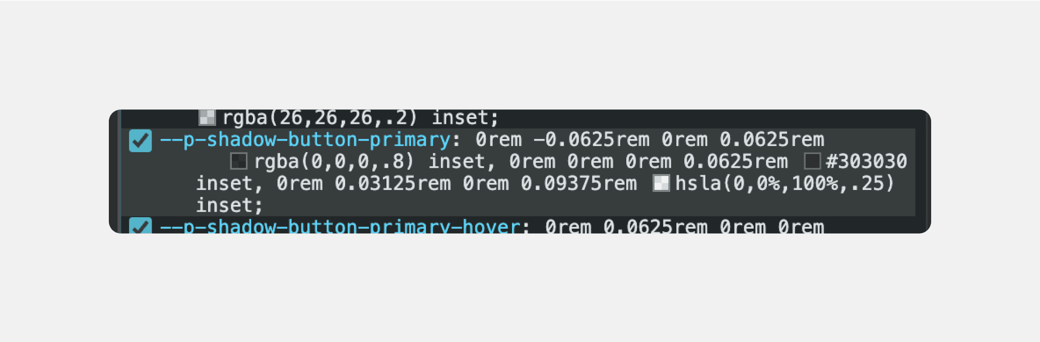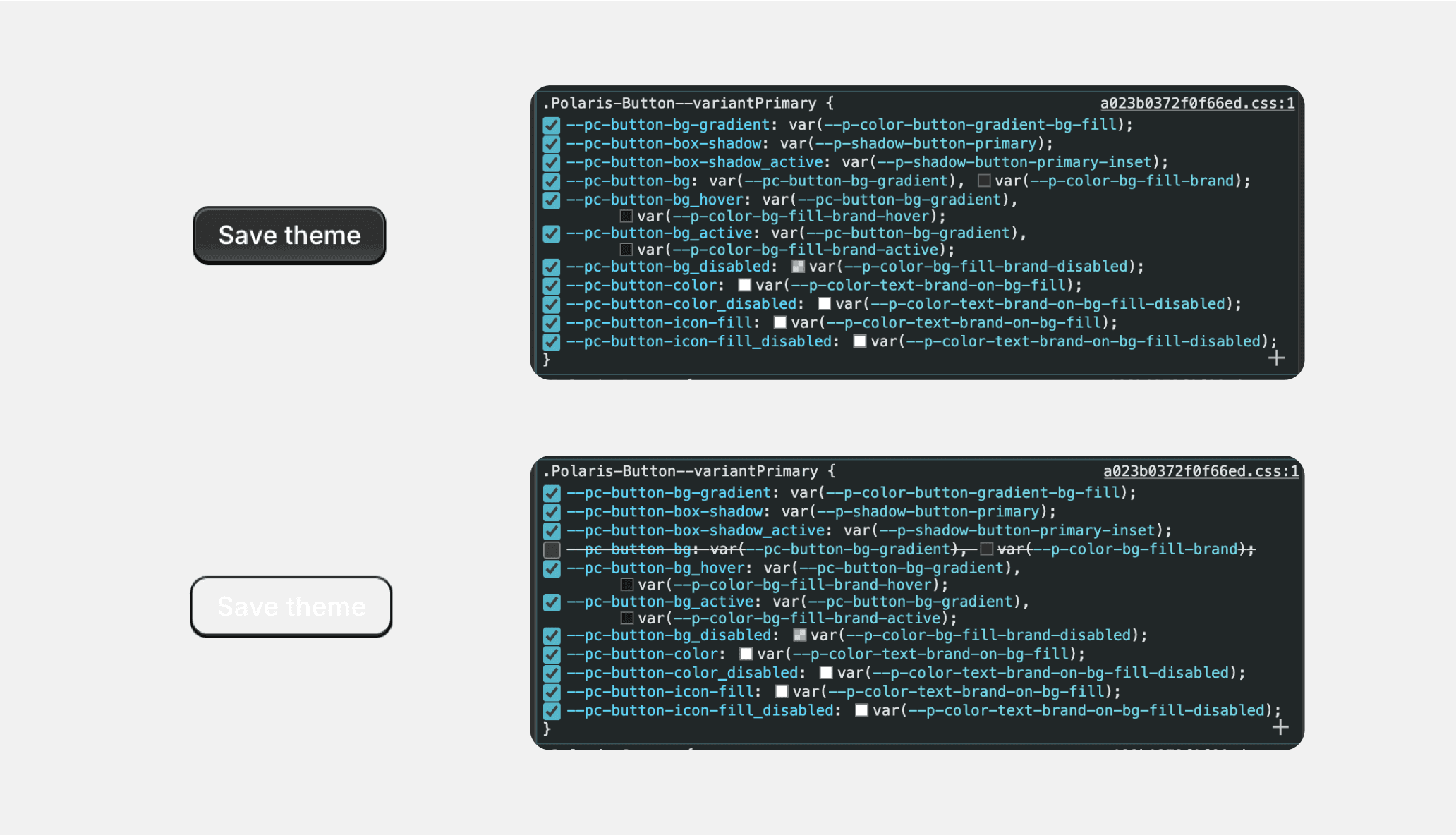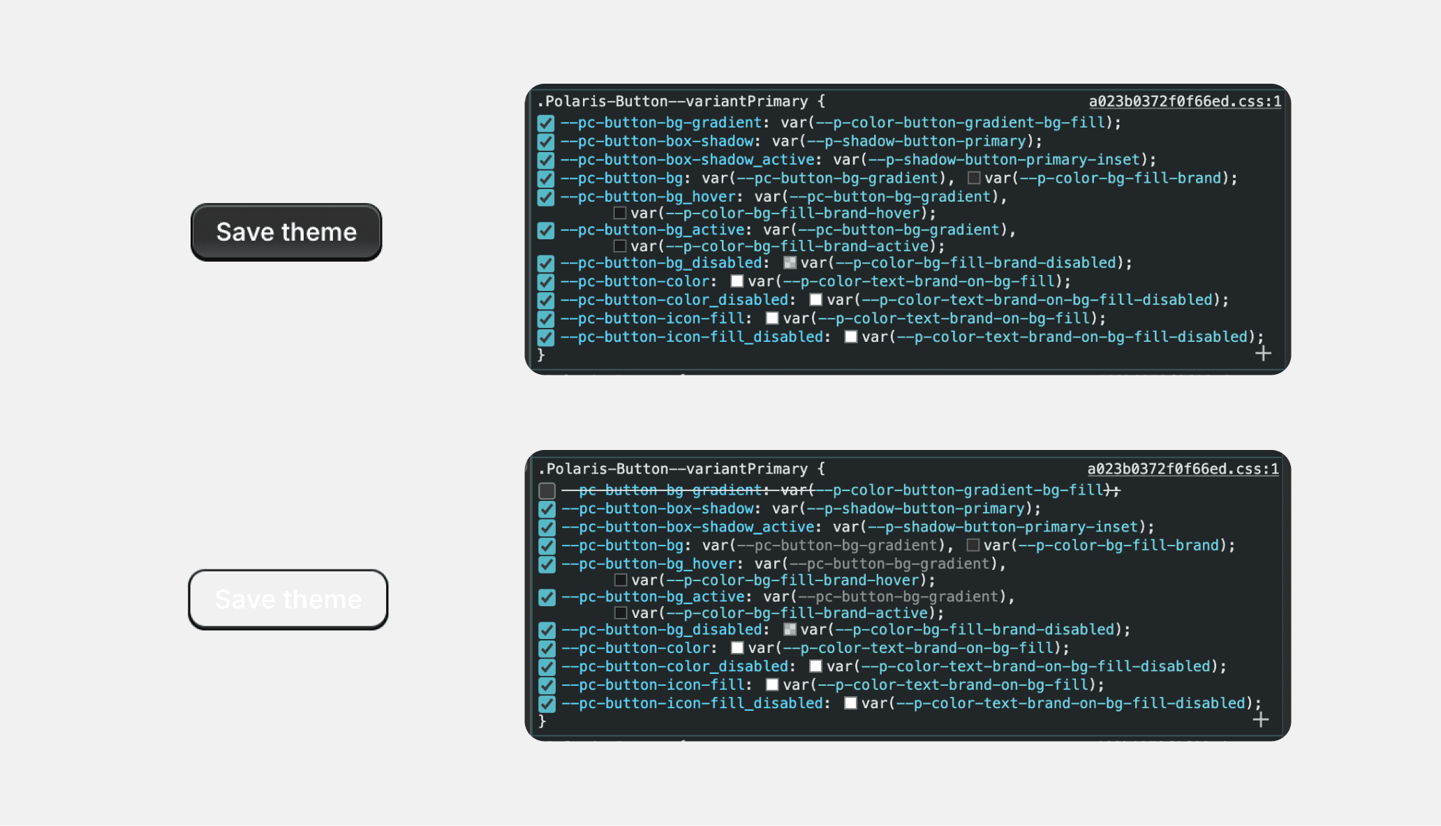For the first token, --pc-button-bg-gradient equals --p-color-button-gradient-bg-fill, which in turn equals the value linear-gradient(180deg,rgba(48,48,48,0) 63.53%,hsla(0,0%,100%,.15))