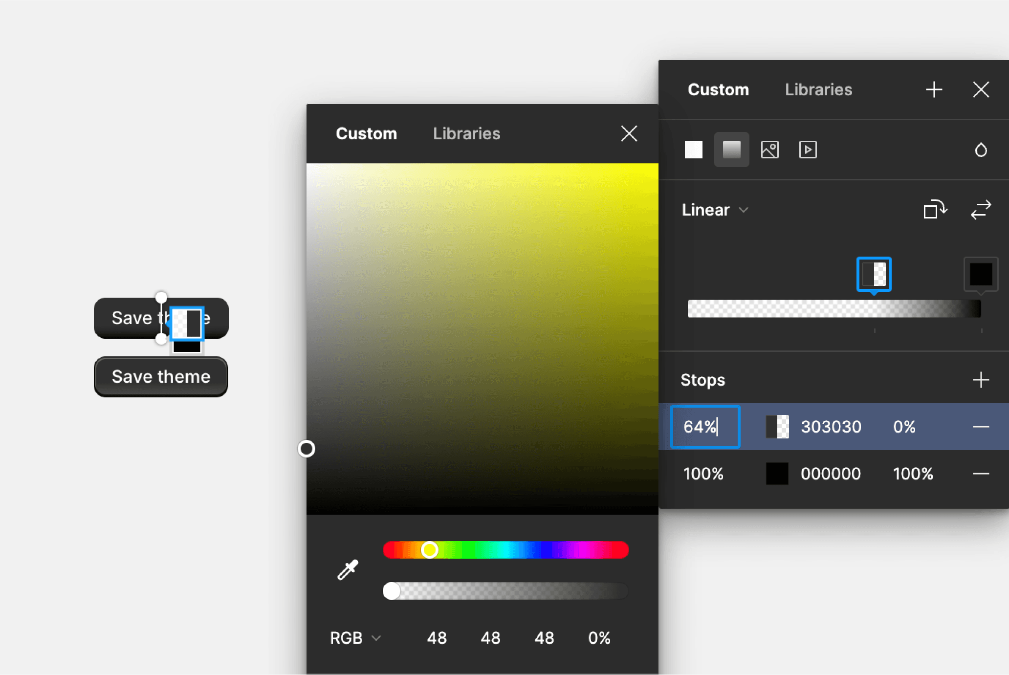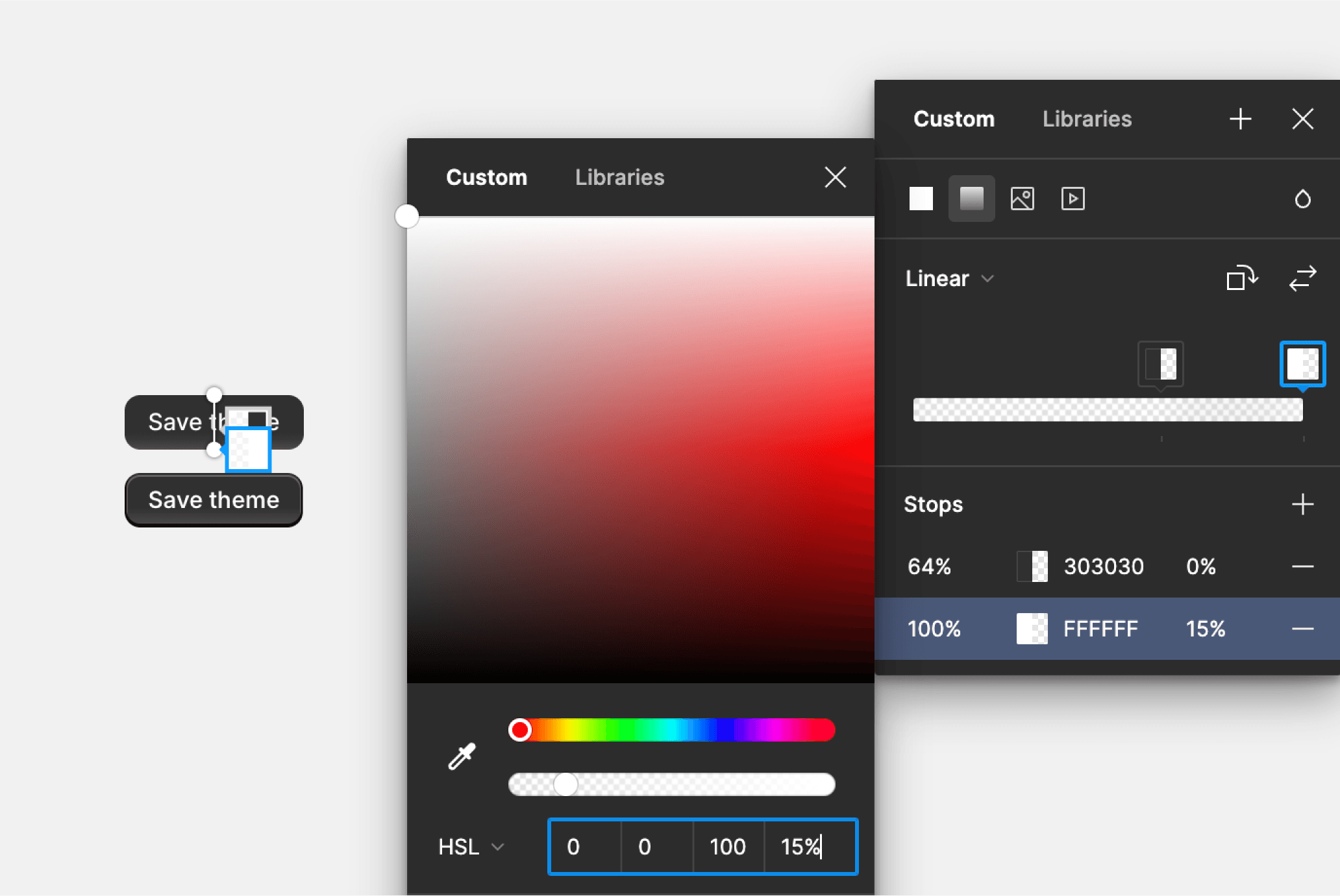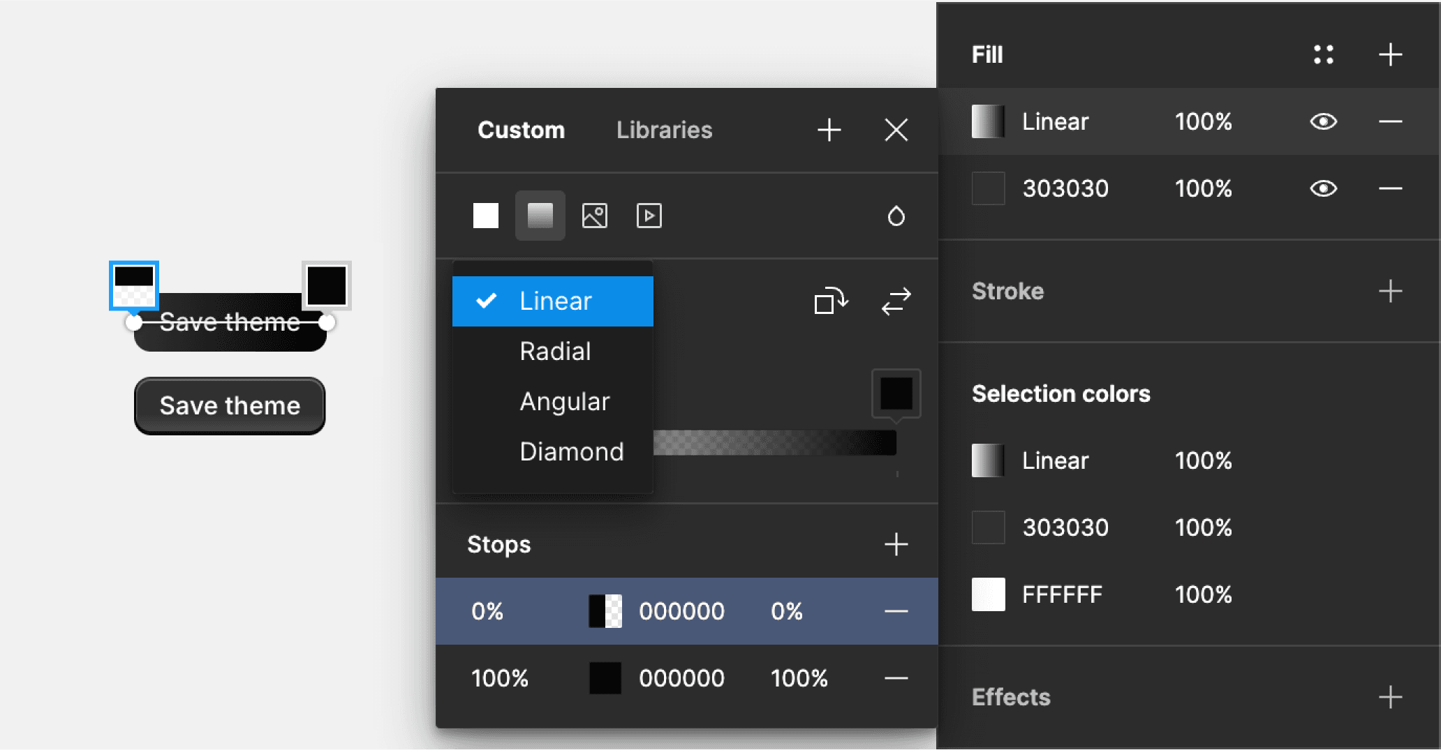 The first part linear-gradient means gradient will be Linear type, as opposed to Radial, Angular, or Diamond. For my button, I create another fill (and turn its opacity to 100% from default 20%) and turn it into gradient. Linear is already the default value for gradient fills.