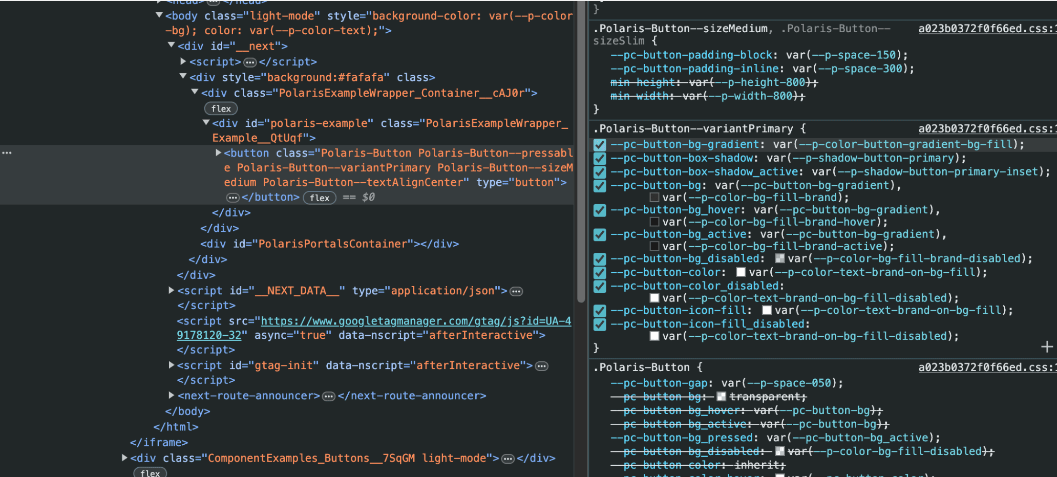For this button, it’s the .Polaris-Button--variantPrimary section. And here, when you hover on a line, you can see checkboxes that will inactivate them on the page.