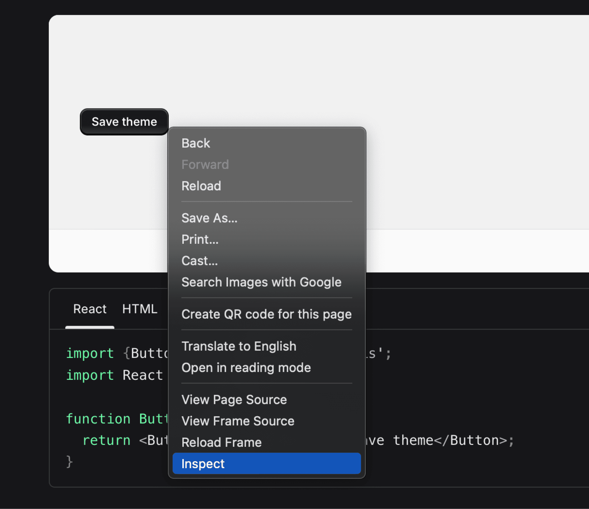 To start inspecting the primary button, just right-click on it and select Inspect from bottom of the list. This will open a new panel within your browser.