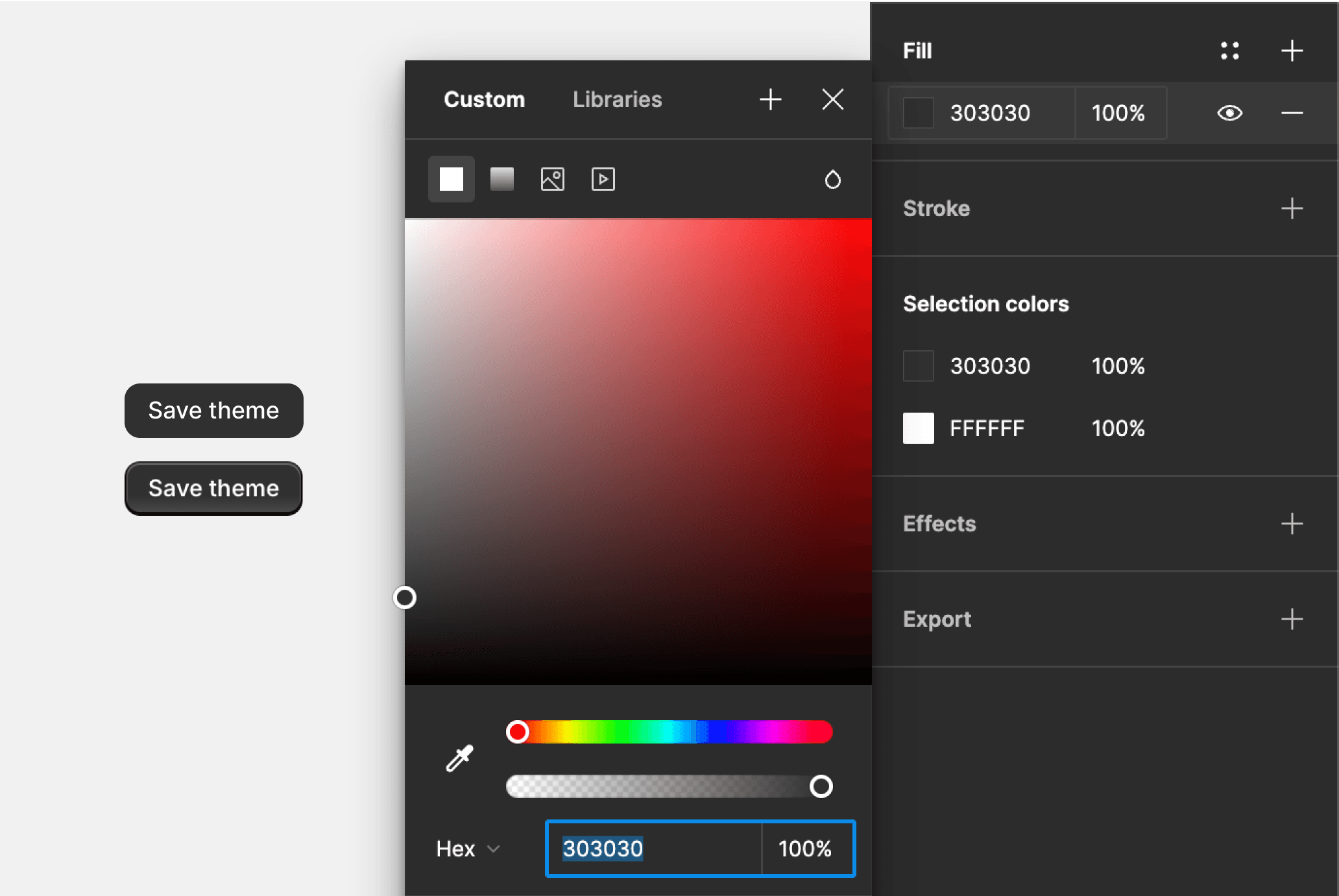 With padding values of 12px for left and right, 6px for top and bottom, my button also gets the height of 28px. I don’t see the radius value here, but I can look and estimate that it’s 8px, and I can check CSS later to make sure. And finally for the background color value, I see the color #303030, so I fill my button with this color.