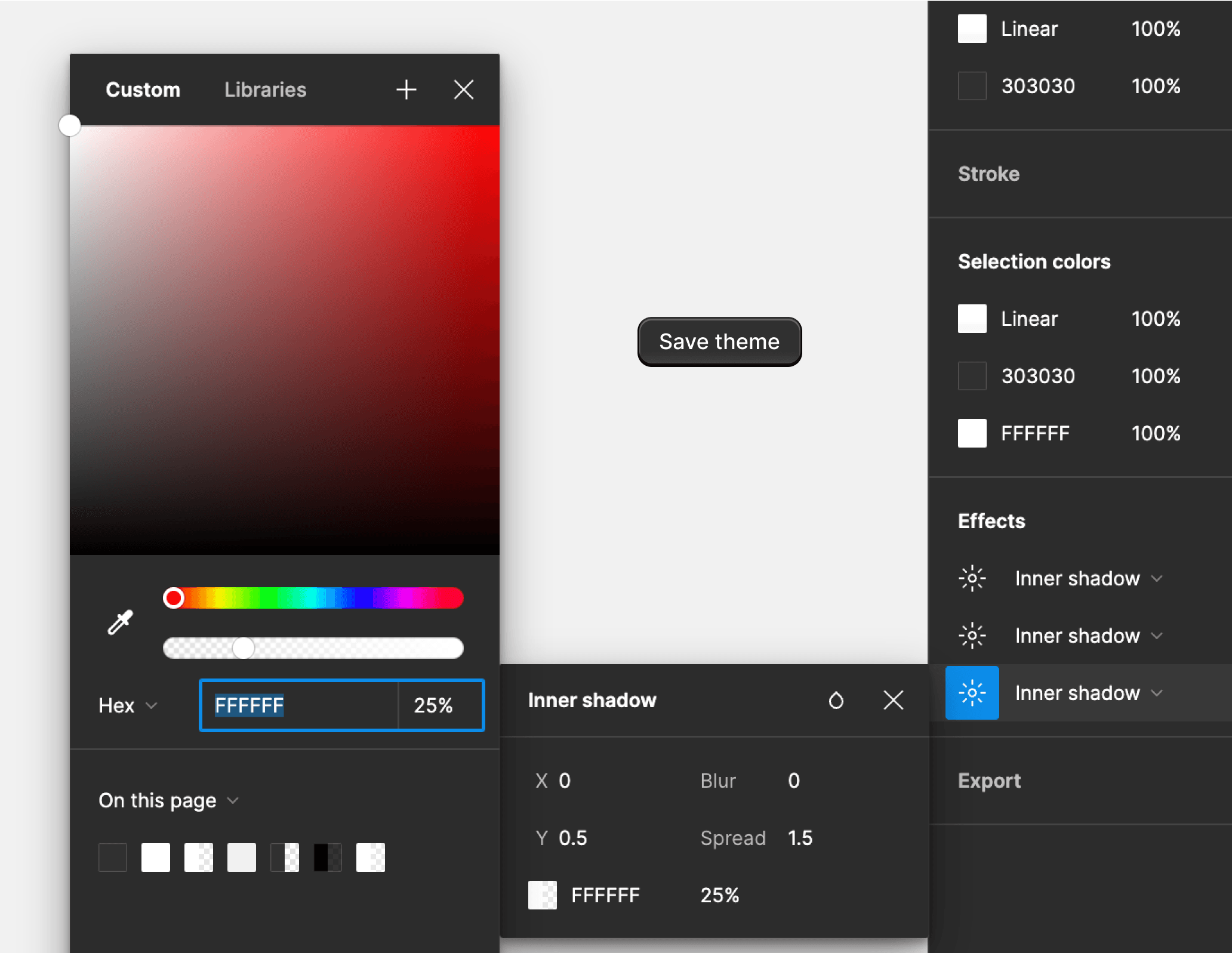For the third shadow’s values 0rem 0.03125rem 0rem 0.09375rem hsla(0,0%,100%,.25) inset, I create an Inner Shadow with values of X:0, Y:0.5, Blur:0, Spread:1.5, with pure white at 25% opacity. This adds the lighter line on top side that gives the feeling of being lit up from up, and combined with second shadow, creates an effect of button popping out.