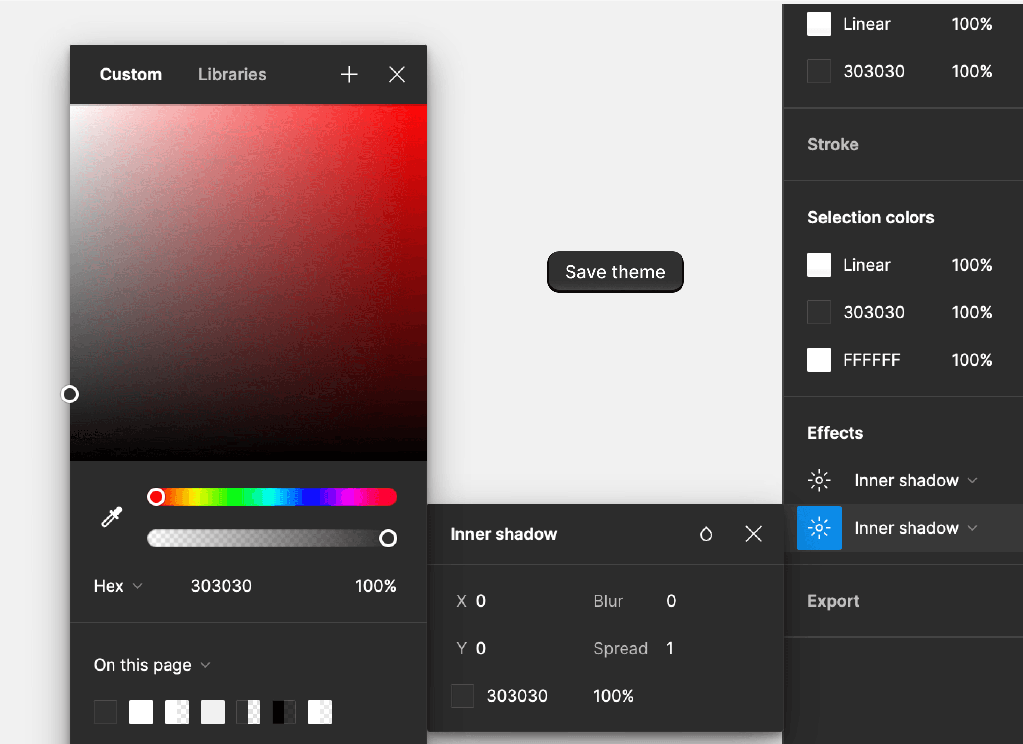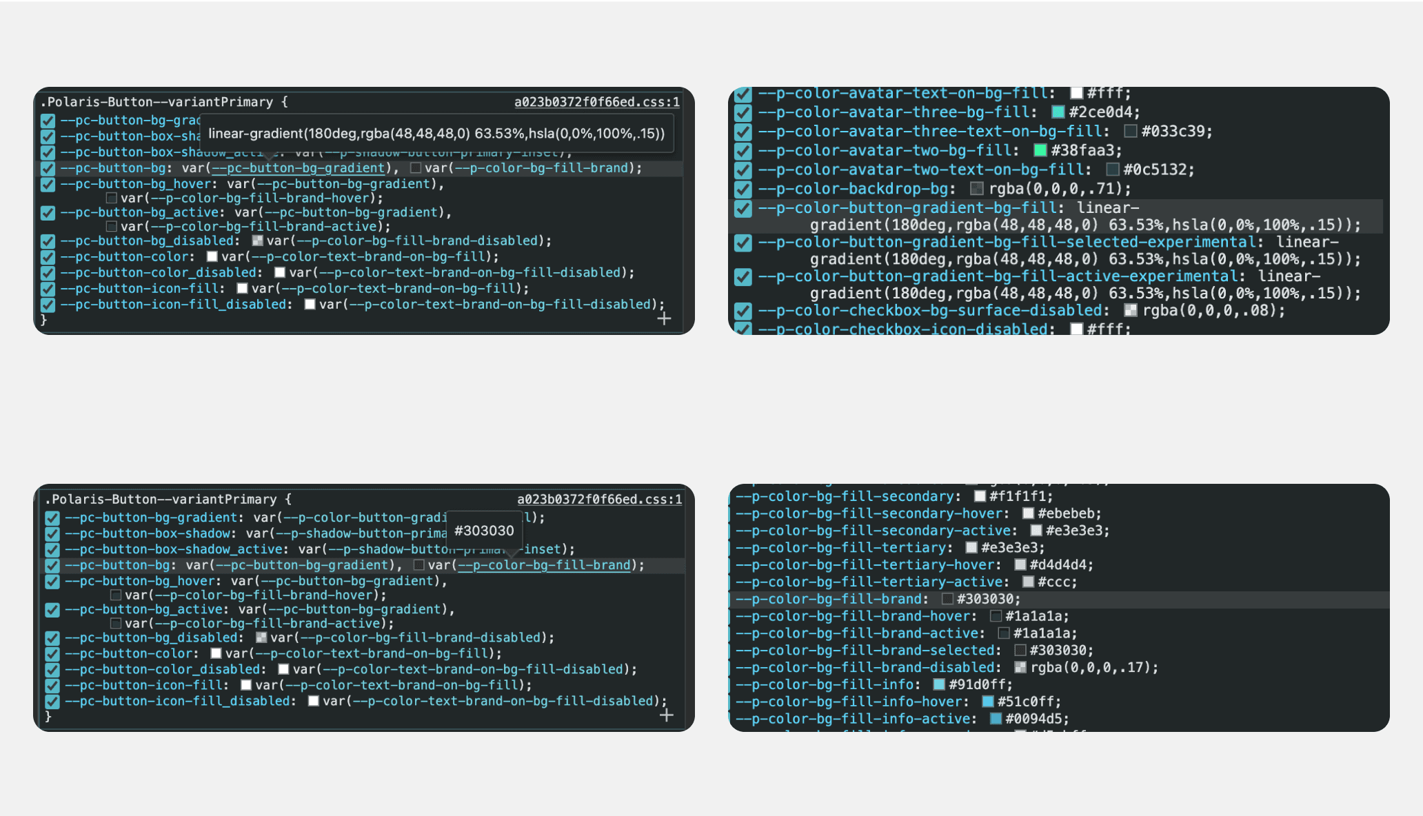 For the second token, it’s simpler. --p-color-bg-fill-brand equals #303030. This is the value I used when I started creating my button on Figma. So what I need on top of this fill color is the gradient value I found here.