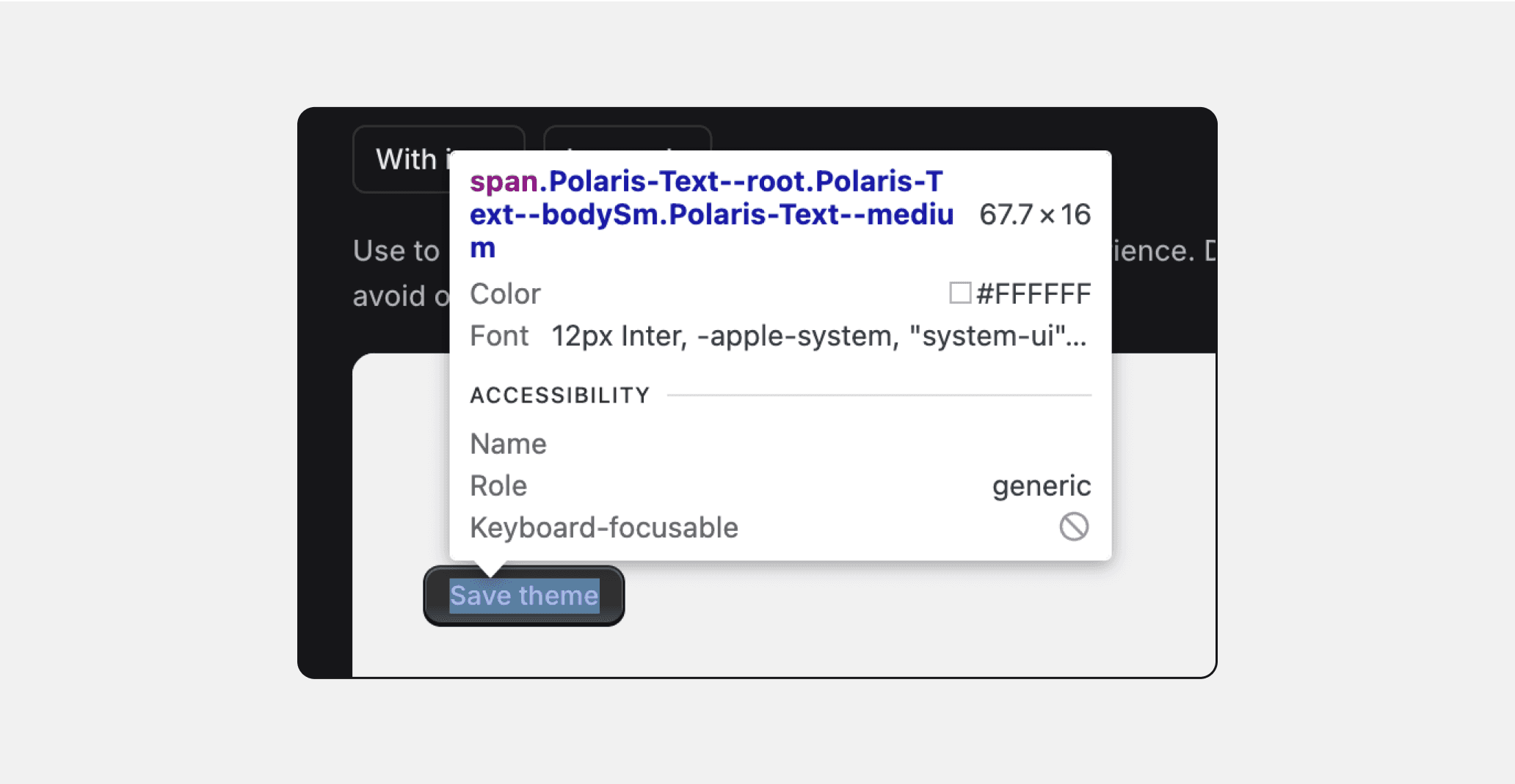 When I hover on the text alone, I can see its details. The font is Inter, with 12 points font size, and plain white #FFFFFF color value. From element size (67.7 x 16), I understand the line height is 16 points, and from the element name, I learn that font weight is Medium.